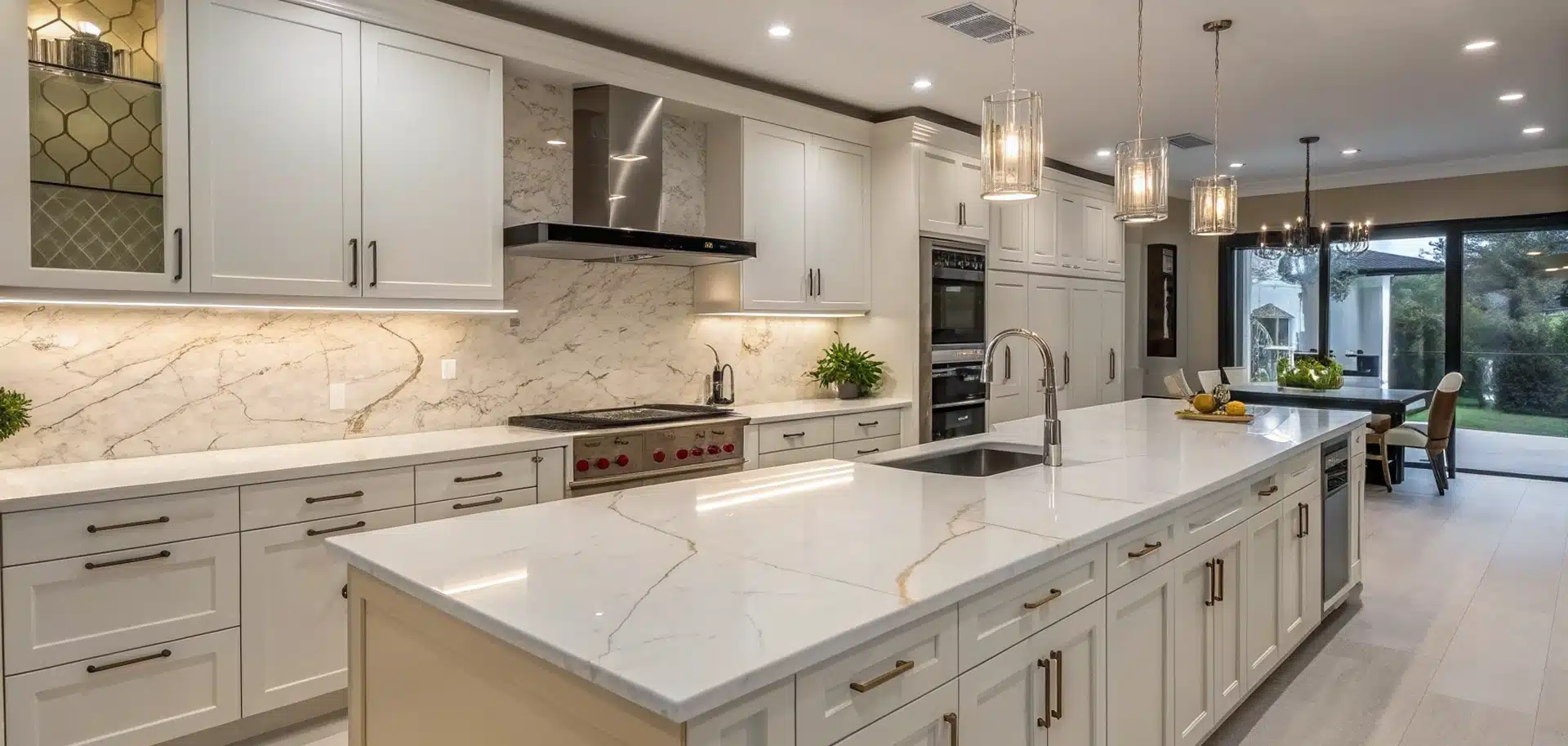 Using quartz or granite as a full-height backsplash creates a seamless, low-maintenance surface that ties perfectly into your countertops. No grout lines, no delays, just one sleek installation that saves time and looks incredible.